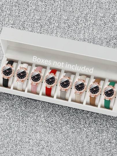 8 件/套女士时尚休闲水钻装饰数字表盘石英手表组合 - 彩色 - 查看 8