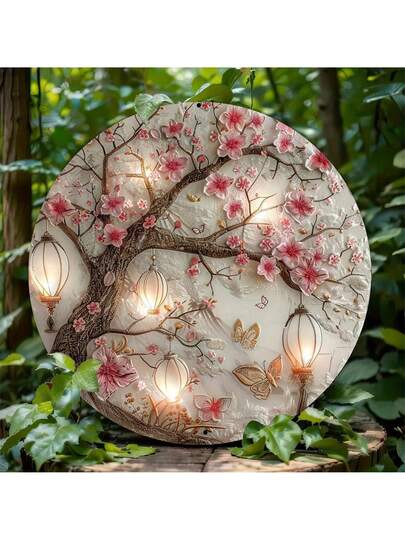 8x8英寸复古铝制墙饰,樱花与灯笼夜景,防水防锈,适用于家居、咖啡厅、花园装饰,室内/室外皆可使用,房间装饰,顶部/底部/左侧/右侧随机开孔 - 彩色 - 查看 1