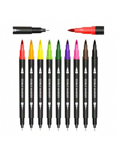 9色食用色素笔,双头设计,一头粗一头细,适用于饼干装饰、翻糖、糖霜、绘画、烘焙等。 - 彩色 - 查看 9