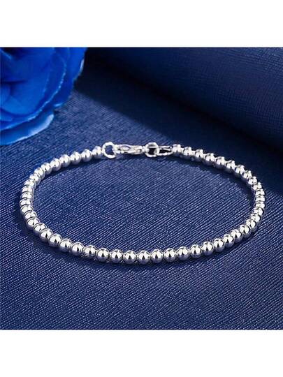 925纯银镀金手链 4毫米串珠链 适合女士男士流行饰品 时尚婚礼派对 - 銀色 - 查看 1