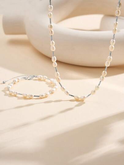 AETOLIA 手工优雅珍珠首饰套装 | 5-6 毫米天然淡水珍珠项链和手链 | S925 银镀铂金/14K 金 | 女友、节日、婚礼、约会配饰 - 銀色 - 查看 1