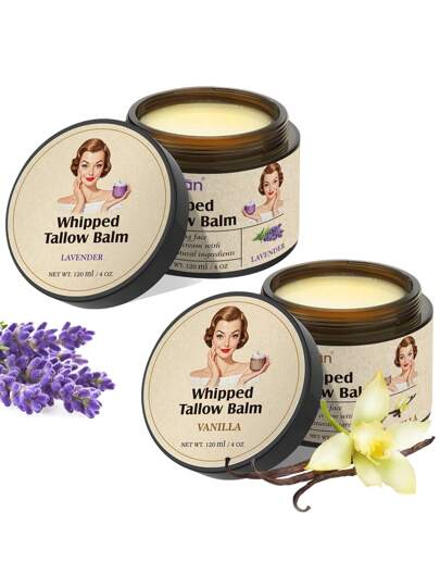 AKBAN 120ML Beef Tallow For Skin Care Set (Vanilla & Lavender) - Whipped Tallow Moisturizer For Face & Body, Grass Fed Beef Tallow Balm, Body Butter Infused With Olive Oil, Natural Skincare Lotion For Dry Skin, Leave Skin Looking Healthy, Smooth, With A Youthful Glow, Grass Fed Grass Finished Organic Face Cream, Body Lotion, And Lip Balm, 4oz, Vanilla/LAVENDER