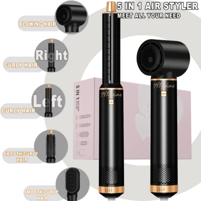 ATOPSKINS 2026升级版五合一热风吹风机及专业沙龙级造型工具 | 5个可拆卸替换刀头 + 3档精准温度设置 | 自动卷发及多种造型(卷发/波浪/直发/柔顺/蓬松/内卷/外卷) | 防毛躁、防静电、持久定型,打造轻盈层次感/刘海造型 - 黑色 - 查看 2