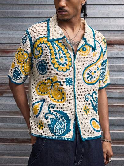AXEPEAK 男士度假腰果图案短袖单排扣镂空针织开衫 - 彩色 - 查看 1