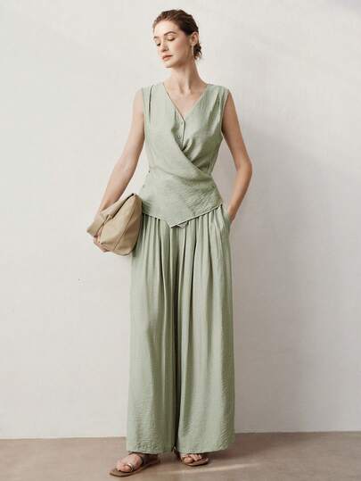 Aalyst 女士春夏套装,优雅时尚V领无袖交叉扭结上衣+阔腿裤两件套,灰绿色带口袋 - 綠色 - 查看 1