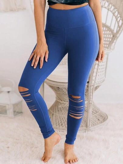 女士純色簡約中空打孔緊身褲 - 藍色 - 查看 1