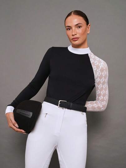 Activina 女士蕾丝拼接立领休闲百搭马术长袖上衣 - 黑色 - 查看 1