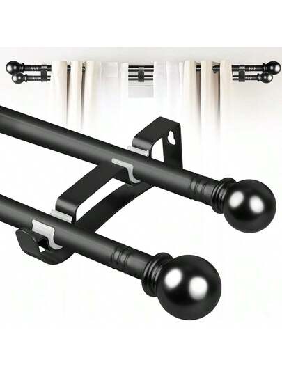 可调节双层窗帘杆套装,长度33-156英寸,金属可伸缩双层窗帘杆套件,适用于各种窗户,包含杆支架。小号加长杆,直径5/8英寸。非常适合用于浴室、卧室和客厅的遮光窗帘。 - 黑色 - 查看 1