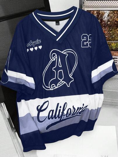 Aesthetic Post 男士 V 领字母印花短袖宽松休闲 T 恤 - 寶藍色 - 查看 1