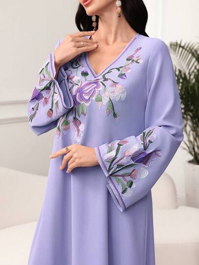 Al Najma 刺绣长袖休闲连衣裙,夏季时尚,端庄 - 紫色 - 查看 1