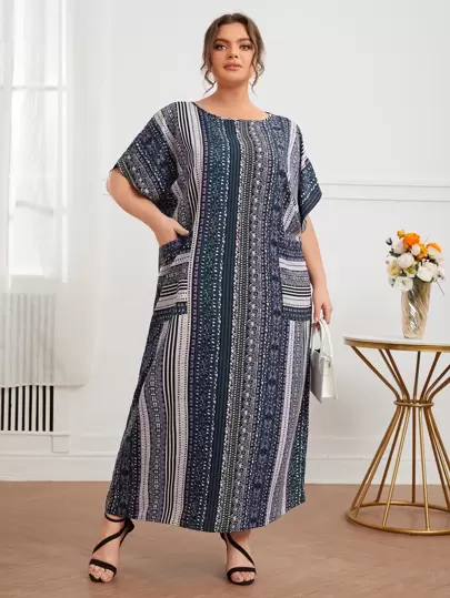 Al Najma 夏季加大贴袋条纹印花束腰连衣裙 - 彩色 - 查看 1