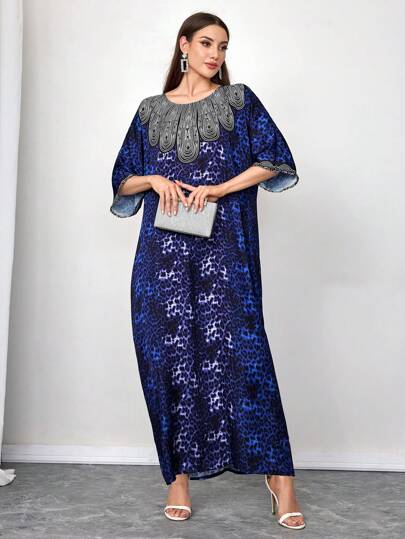 Al Najma 女士圆领亮片蝙蝠袖优雅长袍,朴素派对长款全长长袍,适合晚会/婚礼嘉宾/周年纪念/日常 - 藍色 - 查看 1