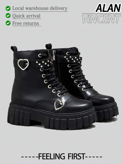 Alan Vincent[Free Returns And Exchanges][Local Delivery][Quick Arrival][Classic Boots Series]New Classic Women's Black Mid-Calf Boots Boots Easy And Comfortable To Wear Women's Platform Boots Suitable For Parties Lace-Up And Zipper Fashionable Style Women's Boots With Love Buttons Rivet Decoration