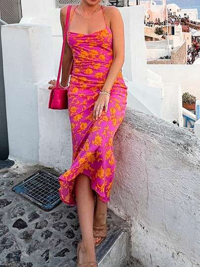 滿版印花露背繫帶吊帶洋裝 - 彩色 - 查看 1