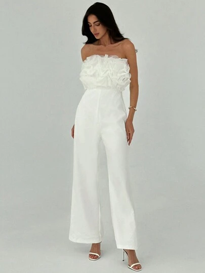 Aloruh 優雅獨特設計網眼拼接寬腿連身褲,完美展現您春夏高挑纖瘦身材 - 白色 - 查看 1