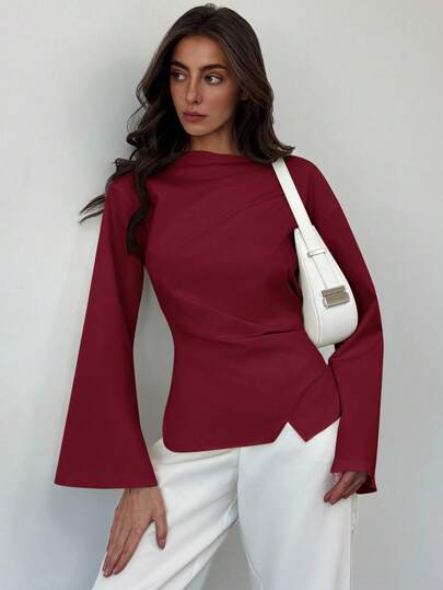 Aloruh 女士船领喇叭袖短款褶皱办公衬衫,秋季上衣,优雅女士衬衫 - 酒紅色 - 查看 1