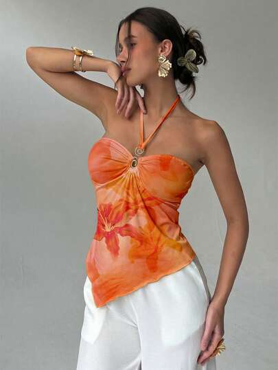 Aloruh 女士夏季橙色百合花印花褶皱不对称下摆时尚吊带背心,夏季度假上衣,夏季假日套装,女士度假服饰 - 橘色 - 查看 1
