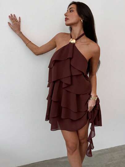 Aloruh 女士甜美多层荷叶边露背系带露脐迷你连衣裙 - 咖啡 - 查看 1