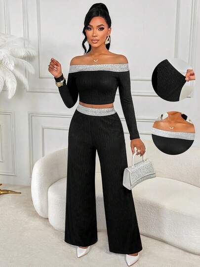 Amarilo 黑色性感露肩长袖修身短款上衣和阔腿裤女式两件套,采用银色丝带拼接设计和针织弹力条纹面料,适合日常休闲外出装、女士办公室装、别致风格、女士秋季服装、女士冬季服装 - 黑色 - 查看 1