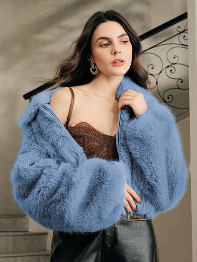 Anewsta 休闲拉链仿毛领外套 - 藍色 - 查看 1