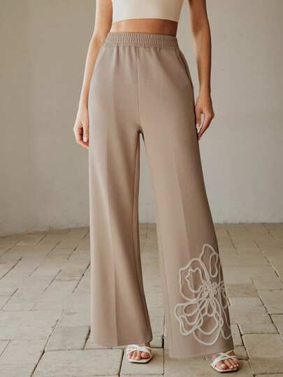 Anewsta 优雅时尚休闲外出/派对针织弹力抽绳刺绣3D花卉卡其色女式运动裤,春夏、新年、情人节穿搭 - 卡其色 - 查看 1