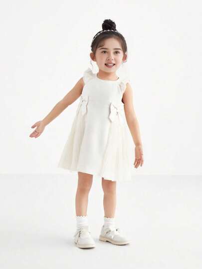 Annil 少女夏季甜美圓領可愛蝴蝶結褶皺網紗兒童裙 - 香檳色 - 查看 1