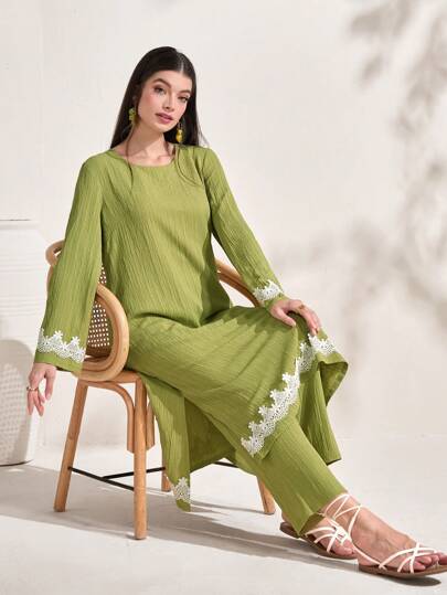 Al Najma 貼花下擺開叉上衣和褲子 - 綠色 - 查看 1
