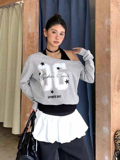女士不对称肩部印花卫衣,性感修身款,初秋新品 - 灰色 - 查看 1