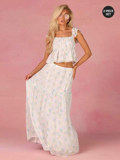 Athîral 女士休闲碎花黄粉印花上衣和长裙两件套 - 黃色 - 查看 1