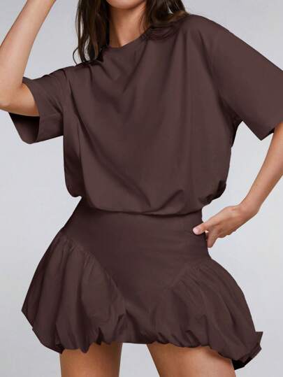 Athîral 女式纯色圆领落肩荷叶边下摆迷你连衣裙,夏季 - 棕色 - 查看 3