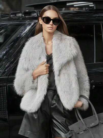 秋冬新款厚人造毛领人造毛内衬中长款时尚皮草效果短款外套 - 淺灰色 - 查看 1