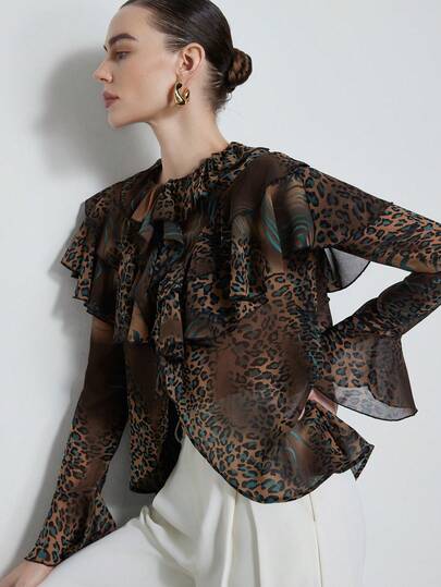Aveloria Modichic 优雅性感随机印花纹理面料翻领系带女式衬衫 - 彩色 - 查看 1