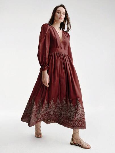 Aveloria Modichic 新款优雅收腰V领单面刺绣花瓣袖长裙 - 彩色 - 查看 1