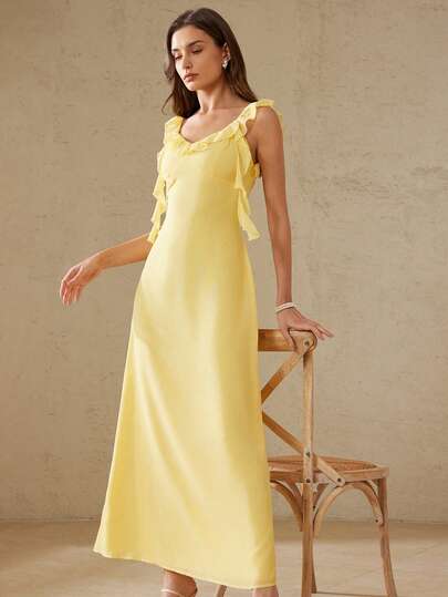 Aveloria Rosie 优雅轻盈雪纺方领露背荷叶边下摆无袖连衣裙,性感派对女装