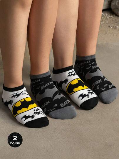 BATMAN X SHEIN 2 双柔软透气吸湿排汗休闲短袜,带蝙蝠图案,时尚酷炫黑白短袜,加固脚趾和脚跟,经久耐用,男女通用,四季百搭夏冬图案袜子