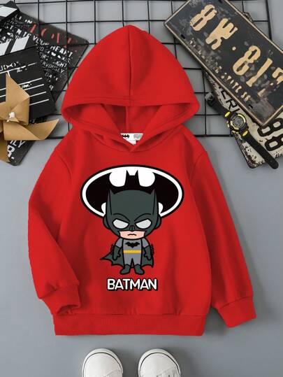 BATMAN X SHEIN 男童卡通字母印花落肩宽松抓绒卫衣,秋冬款 - 紅色 - 查看 1