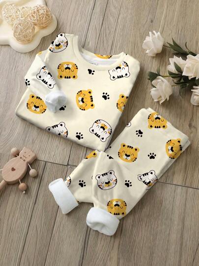 SHEIN 男婴休闲卡通老虎印花舒适长袖上衣和裤子套装,秋冬舒适家居服 - 彩色 - 查看 1