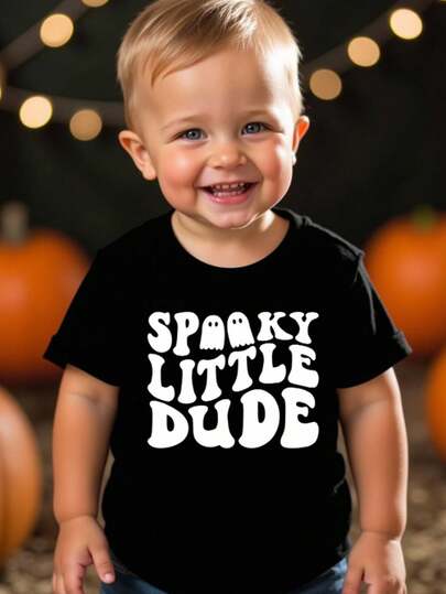 SHEIN 男童休闲宽松舒适万圣节英文字母可爱风格卡通印花短袖上衣,适合夏季 - 黑色 - 查看 1