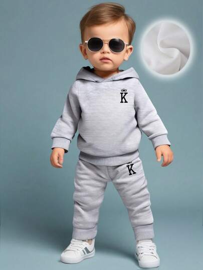 男婴皇冠和字母“K”印花羊毛连帽衫和裤子套装,秋冬季休闲装 - 灰色 - 查看 2