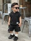 SHEIN Vintaside Kids 2 件套幼儿男婴罗纹撞色 T 恤和蓝色裤子套装,休闲舒适百搭,适合夏季所有场合