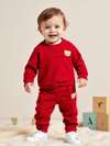 SHEIN Playful Pals 2 件套男婴春秋季套装,酒红色圆领长袖上衣搭配同色裤子,饰有小熊刺绣,休闲
