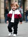 SHEIN 男婴街头摩托风格撞色拼接字母印花立领摩托夹克,适合秋冬季外套