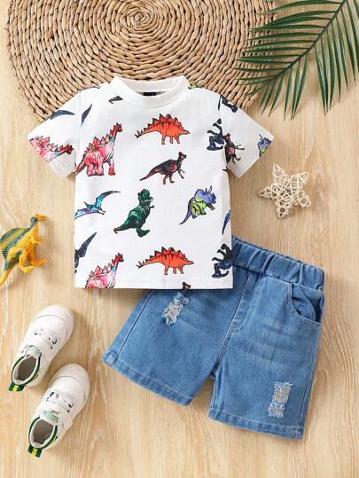 嬰兒男童恐龍印花短袖t恤和牛仔短褲套裝 - 白色 - 查看 1