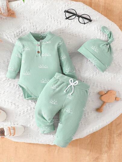 嬰兒男童春秋長袖鈕扣小立領三角印花連體褲裝與蝴蝶結褲和帽子隨性套裝 - 綠色 - 查看 1