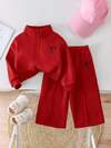 SHEIN 女婴可爱休闲红色绉纱蝴蝶结装饰吊带背心和松紧腰裤套装