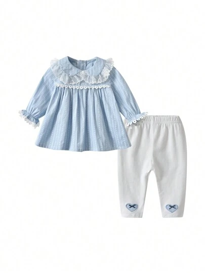 女婴心形印花荷叶边领条纹衬衫和裤子休闲套装 - 藍色 - 查看 1