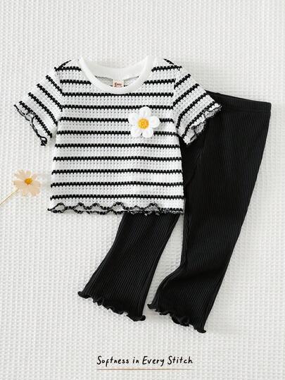 女婴柔软针织圆领短袖T恤和松紧腰裤两件套