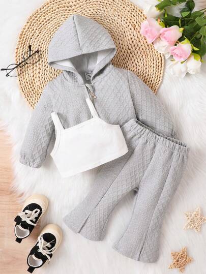 女嬰素色吊帶上衣和下擺開叉喇叭褲和連帽夾克 - 灰色 - 查看 1