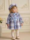 SHEIN 女婴撞色格子图案荷叶边蝴蝶结装饰蓝色连衣裙和帽子套装
