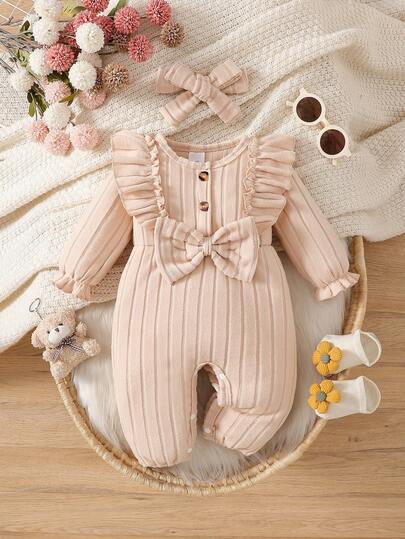 女宝宝杏色纯色拉绒荷叶边领长袖连体裤,配蝴蝶结头带,秋冬季休闲日常穿着 - 杏色 - 查看 1